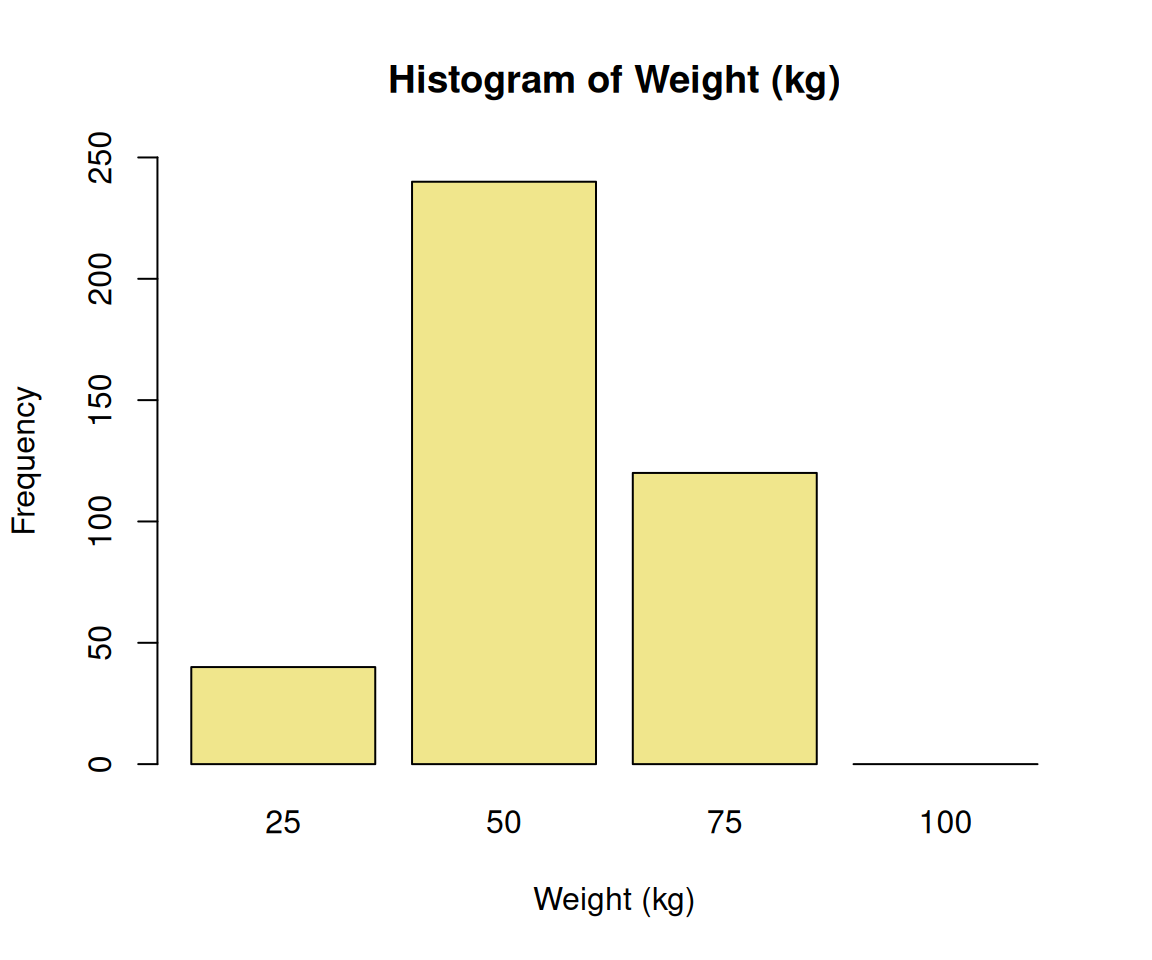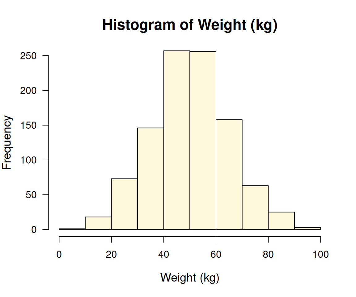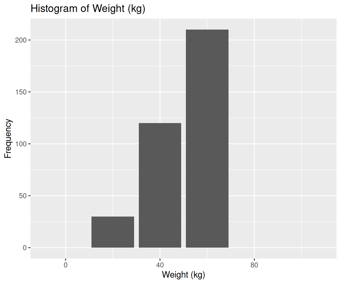 labs(title = "Histogram of Weight (kg)", x = "Weight (kg)", y = "Frequency")